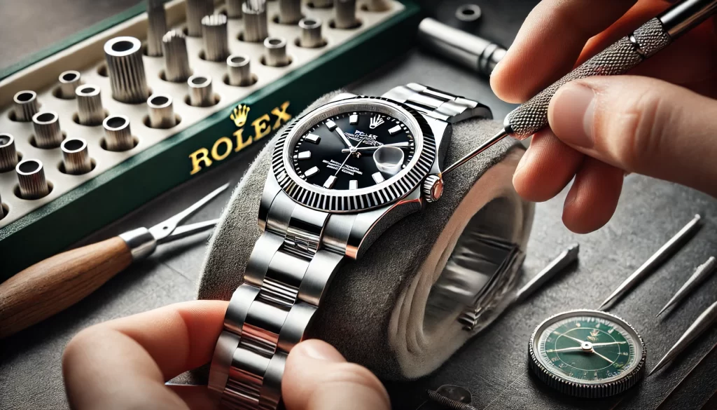 また、ロレックスのブレスレット修理を専門に行っている業者も存在します。こうした専門業者では、摩耗したピンやブッシュを新しいものに交換し、隙間を最小限に抑えることで、ブレスレットの張りを取り戻す作業を行います。ただし、非正規の修理業者に依頼する場合は、作業の品質にばらつきがあるため注意が必要です。修理後の仕上がりが悪いと、ブレスレットの強度が損なわれたり、見た目に違和感が出たりすることもあります。そのため、信頼できる業者を慎重に選ぶことが重要です。